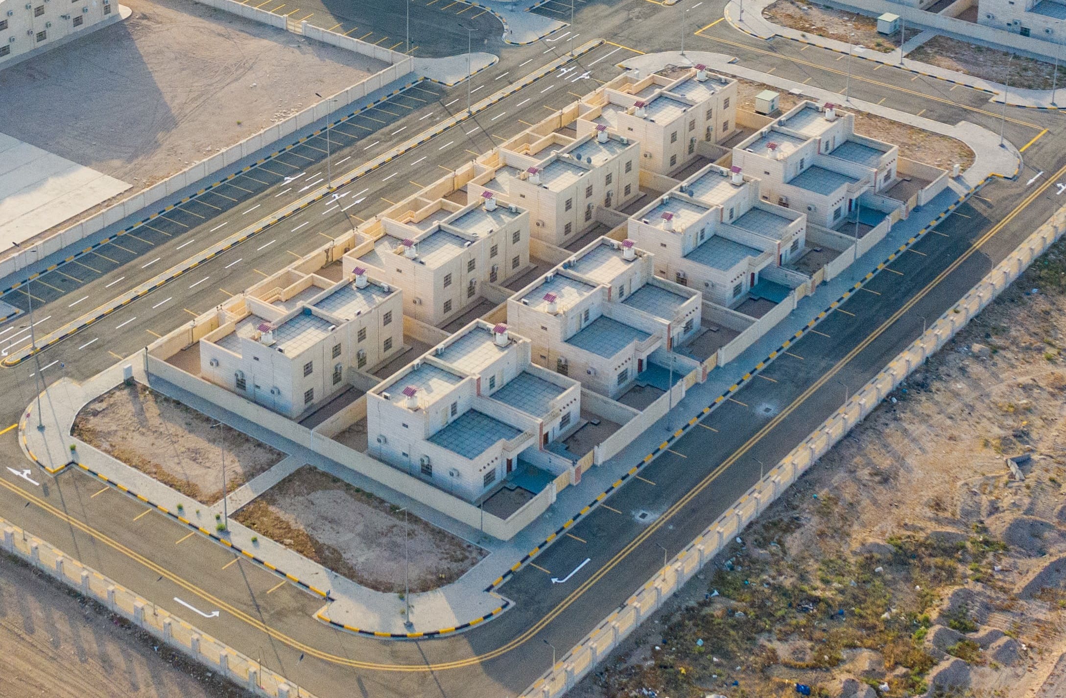 تحتوي الوحدة السكنية على اربع غرف نوم وصالة استقبال وصالة داخلية ومطبخ وحمام سفلي وحمام علوي وحمام للضيوف ومساحة خضراء حول البناء وكراج لوقوف السيارات مع تأمين أجهزة التكييف والمراوح والانارة وسخانات المياه وخزان الماء وتغليف الوحدة السكنية بالحجر الطبيعي.