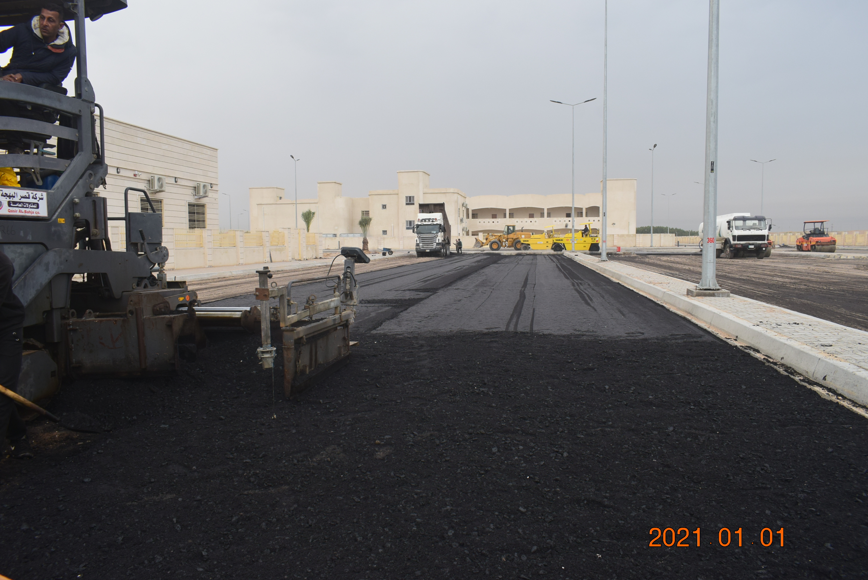 أعمال الطرق: تتضمن تنفيذ شبكة طرق بطول تقريبي 8,25 كيلومتر وبمساحة 130,000 متر مربع بسمك كلي للاسفلت 15 سنتمتر وتنفيذ حواف ارصفة (كيربستون) بطول 23,000 متر طول وتبليط الارصفة وبمساحة 47,000 متر مربع وتخطيط الطرق ووضع العلامات المرورية في الاماكن المخصصة.