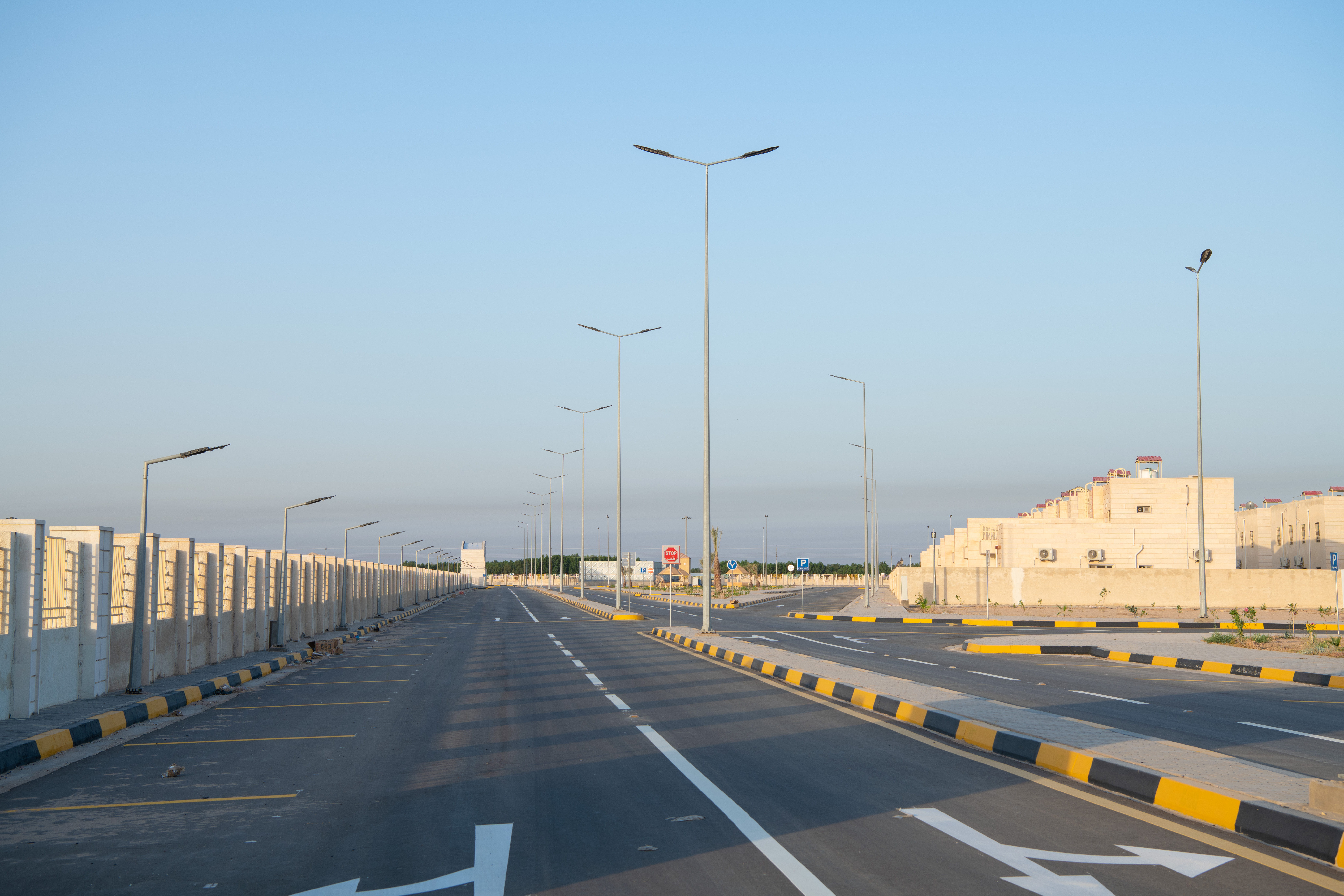 أعمال الطرق:  تتضمن تنفيذ شبكة طرق بطول تقريبي 8,25 كيلومتر وبمساحة 130,000 متر مربع بسمك كلي للاسفلت 15 سنتمتر وتنفيذ حواف ارصفة (كيربستون) بطول 23,000 متر طول وتبليط الارصفة وبمساحة 47,000 متر مربع وتخطيط الطرق ووضع العلامات المرورية في الاماكن المخصصة.